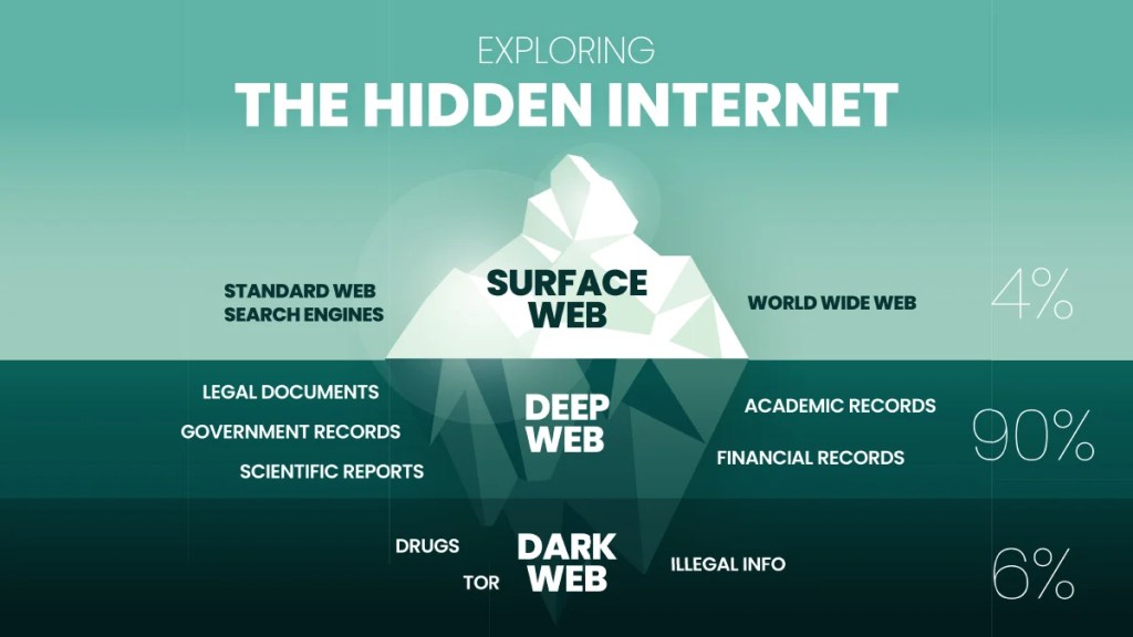 - Dark Web: A small part of the deep web that is intentionally hidden and only accessible via special software like Tor (aka The Onion Router)
